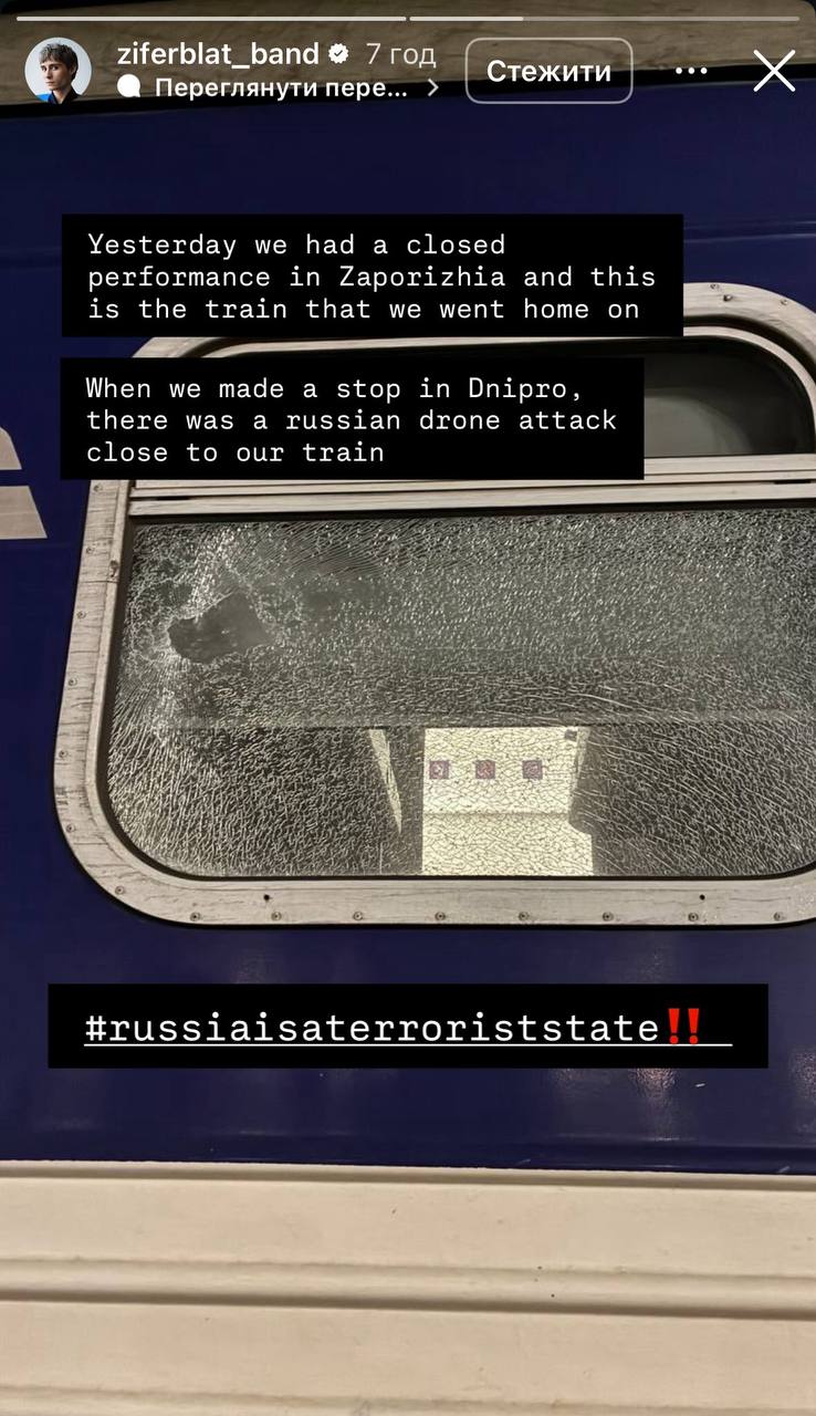 Во время ночной атаки на Днепр известная группа Ziferblat попала под обстрел. Музыканты возвращались поездом с концерта в Запорожье.
