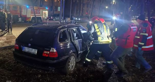 На улице Хмельницкого автомобиль BMW врезался в бетонную опору, в результате чего пассажирку зажало в салоне. Водитель смог самостоятельно выйти из машины до приезда спасателей.
