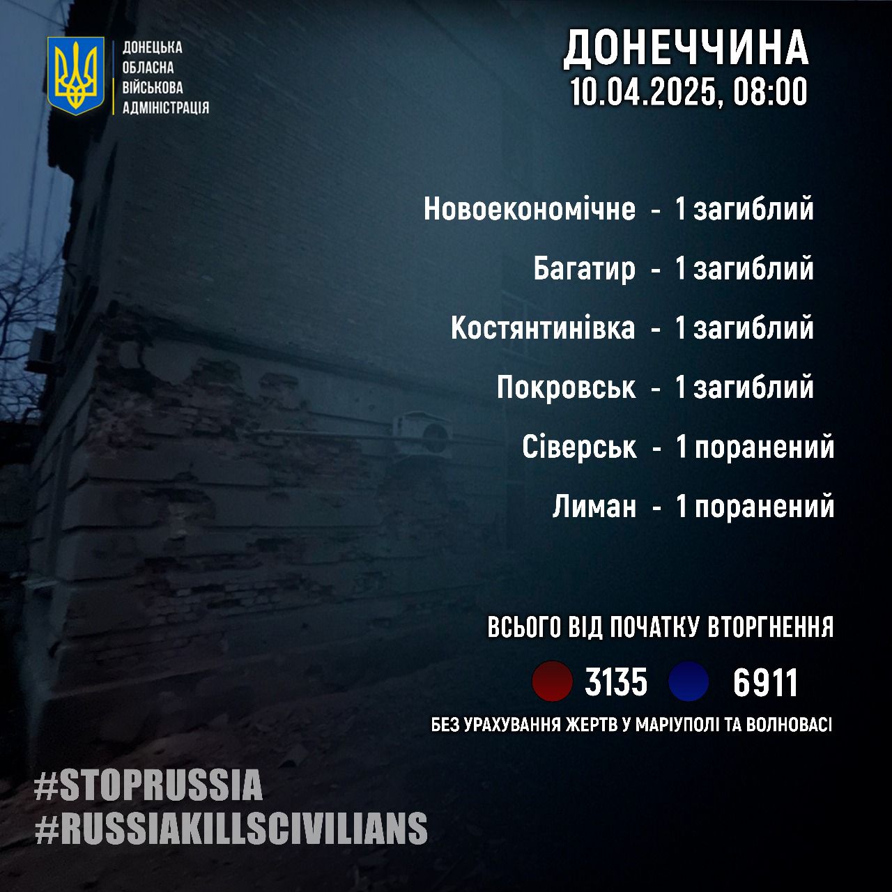 По его словам, россияне убили 4 жителей Донбасса: в Новоэкономическом, Богатыре, Константиновке и Покровске. Еще 2 человека в области за сутки получили ранения.