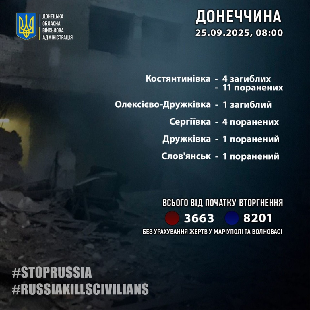Российские войска за прошедшие сутки, 24 сентября, убили пятерых жителей Донецкой области и более десятка ранили