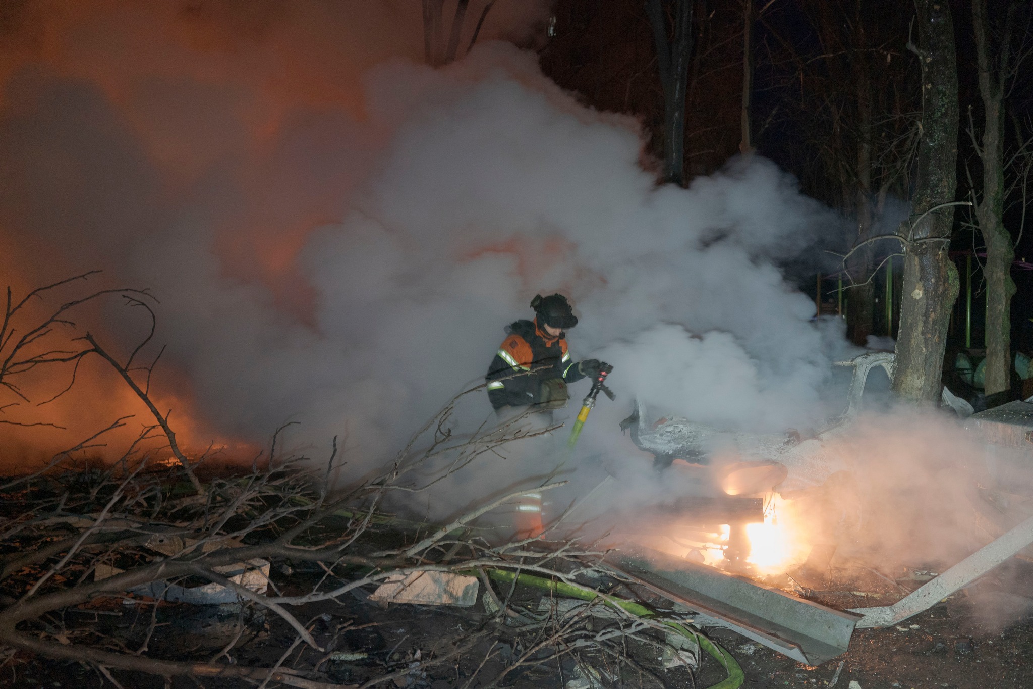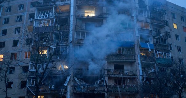 На месте попадания повреждены 11 многоквартирных домов и автомобили. Чрезвычайники ликвидировали пожары на площади 250 кв. м и помогали жителям выбраться из ловушки, открывая деформированную взрывом входную дверь.