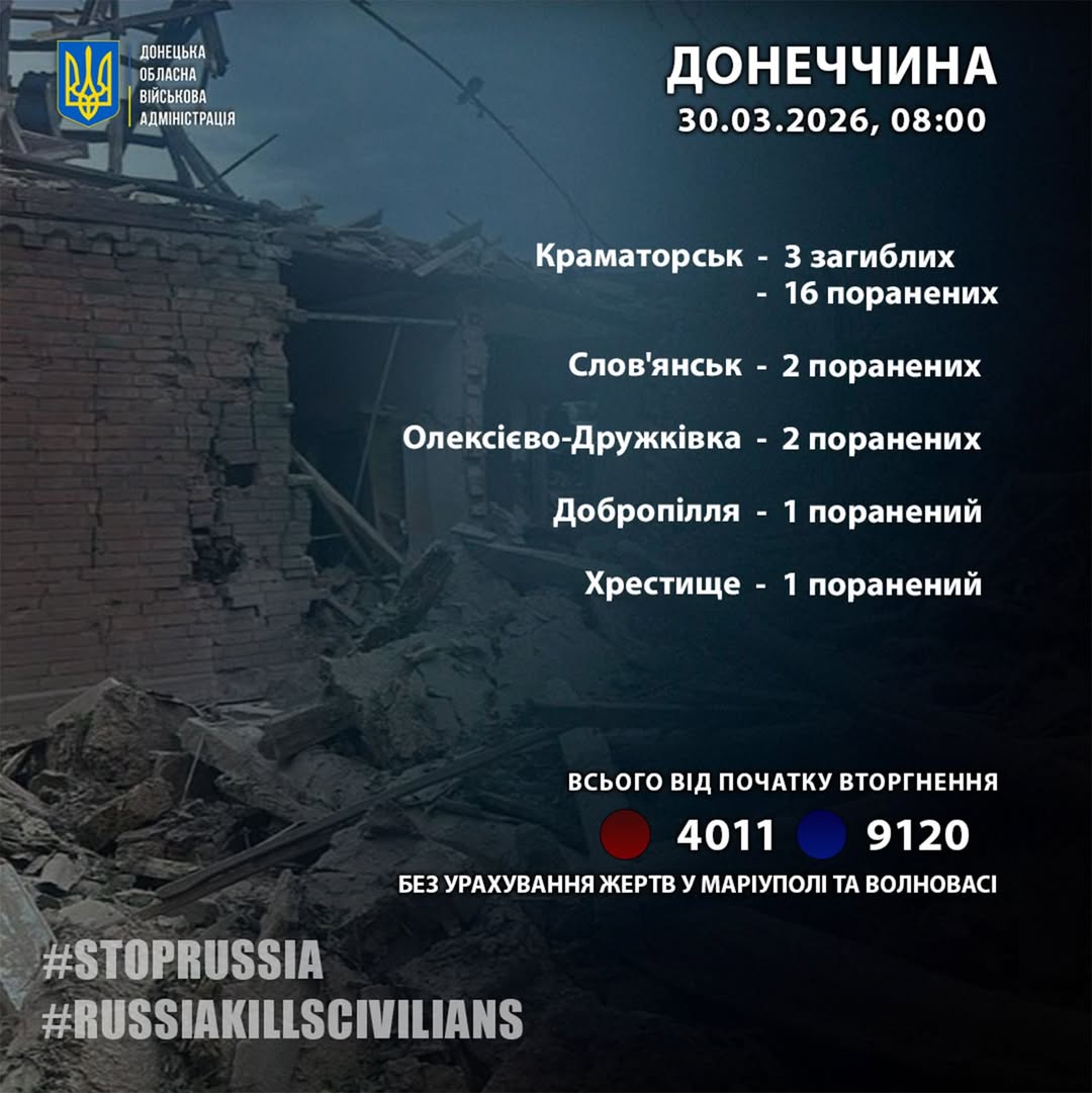 Напомним, в Краматорске 29 марта в результате российской авиационной атаки погибли три человек, среди них – 13-летний ребенок.