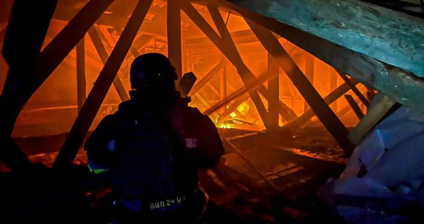 Дроны попали по неэксплуатируемому административному зданию. В результате взрывов загорелась крыша двухэтажного здания на площади 100 кв.м.