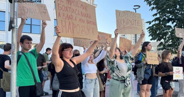 Жители Хмельницкого присоединились к всеукраинским протестам, выступая против законопроекта, который, по мнению участников, угрожает антикоррупционной системе
