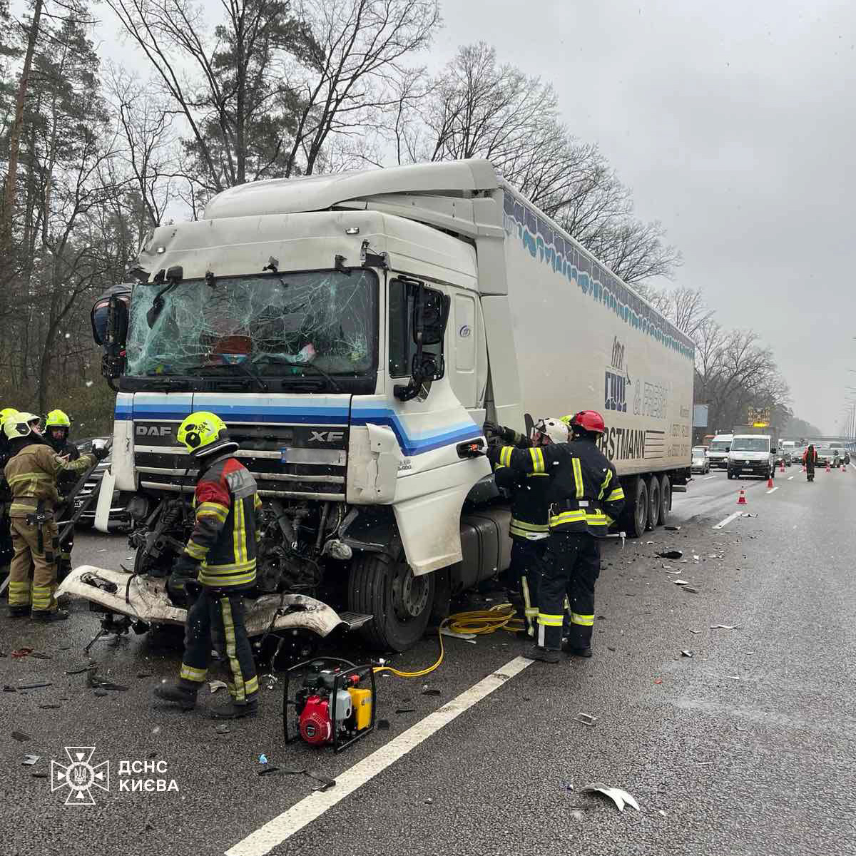 В Киеве столкнулись два грузовика: спасатели деблокировали одного из водителей