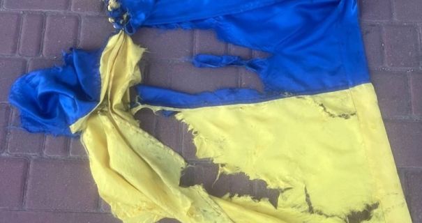 Местный житель, находясь пьяным, сорвал флаг возле одной из автостанций, порвал его и начал топтать.