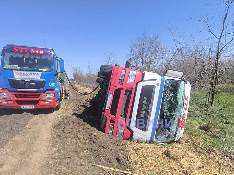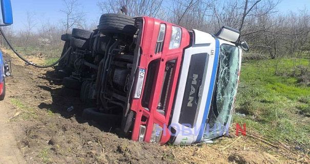 Грузовой автомобиль с цистерной ехал по трассе в направлении Одессы. В какой-то момент водитель не справился с управлением, автомобиль по диагонали пересек проезжую часть, съехал с дороги в кювет и опрокинулся.