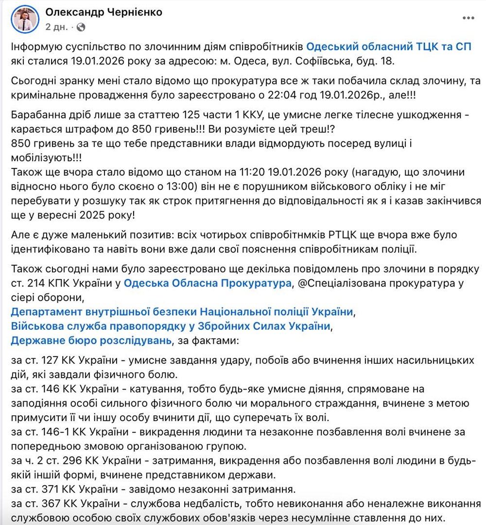 Кроме этого, адвокат сообщил о подаче дополнительных заявлений в правоохранительные органы о возможных преступлениях, связанных с насильственными действиями сотрудников ТЦК. В частности, речь идет об умышленном нанесении побоев, пытках, незаконном лишении свободы и служебной халатности по статьям 127, 146, 146-1, 296, 371 и 367 УК Украины. Сообщения поданы в Одесскую областную прокуратуру, специализированную прокуратуру в сфере обороны, Департамент внутренней безопасности Нацполиции, Военную службу правопорядка и ДБР.