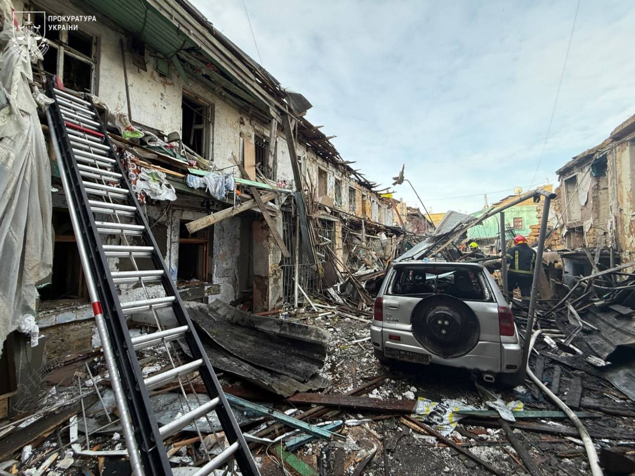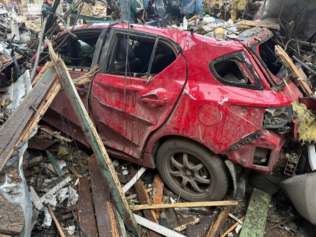 Кроме того, повреждено административное здание, частично разрушен 2-этажный жилой дом, разрушены квартиры на 2-м и 3-м этажах 3-этажного жилого дома. Повреждены 10 автомобилей.