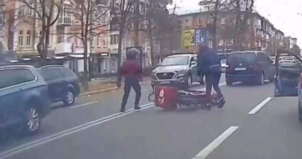 После этого мужчина вышел из автомобиля и стал избивать курьера, который мог попасть под колеса проезжающих машин.