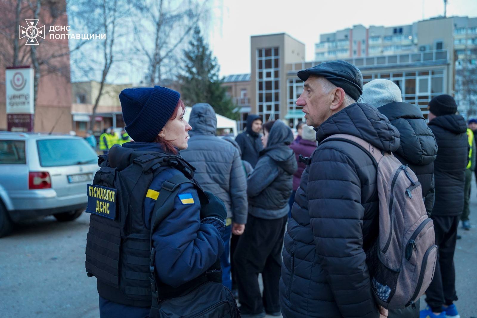 В Полтаве развернули три оперативных штаба для помощи пострадавшим жителям. Там выдают материалы для быстрого ремонта, включая пленку и OSB-плиты. Закрывать выбитые окна людям помогают коммунальные службы.