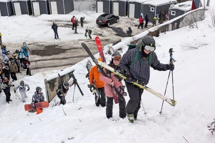 В соцсетях распространились фото и видео, где видно, как отдыхающие поднимались на вершину трасс пешком со своими лыжами и сноубордами, поскольку подъемники временно не работали.