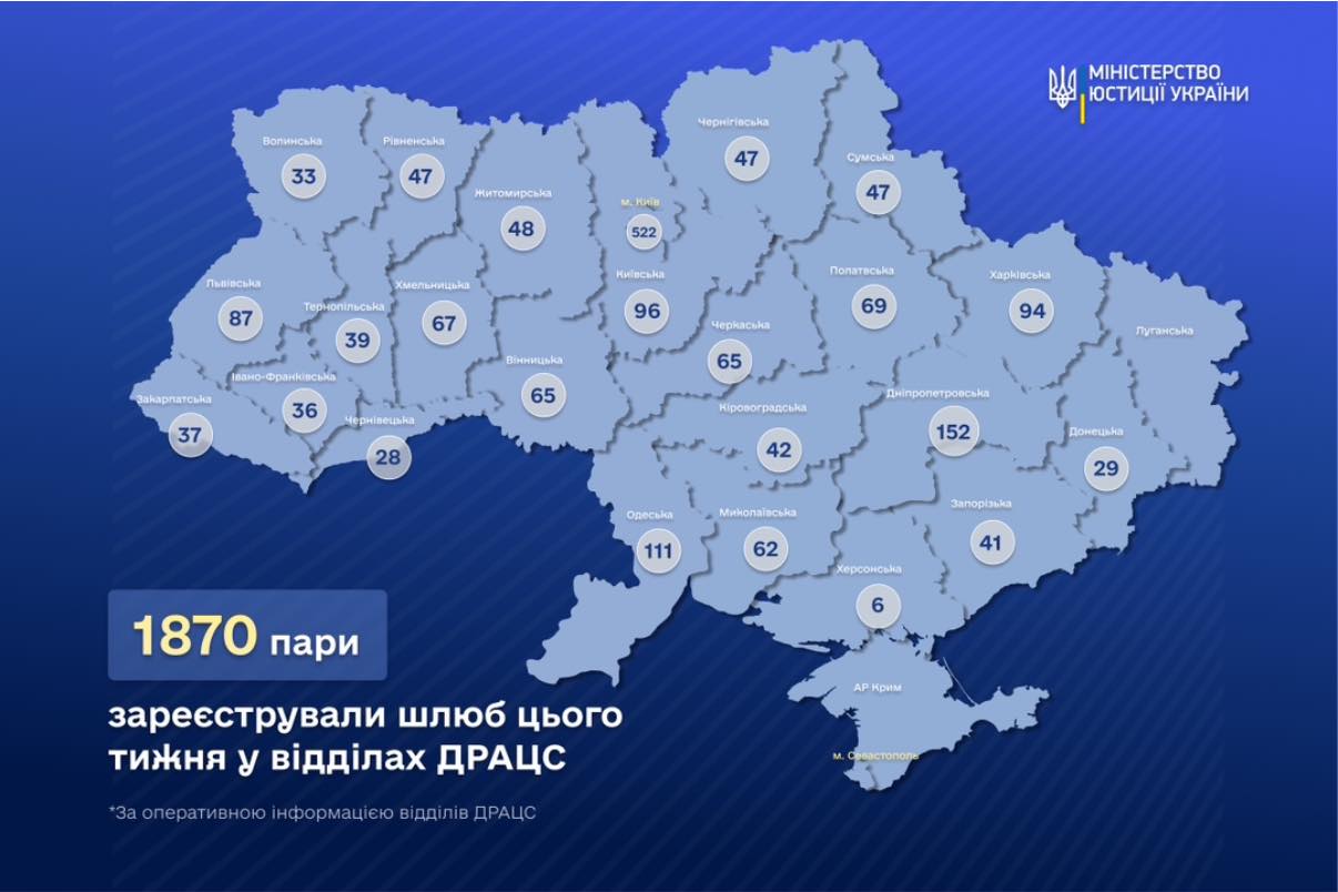 В Министерстве юстиции поделились статистикой по заключению браков в Украине за последнюю неделю. Оказалось, что за это время зарегистрировано 1870 браков по всей стране. В тройке лидеров оказались: