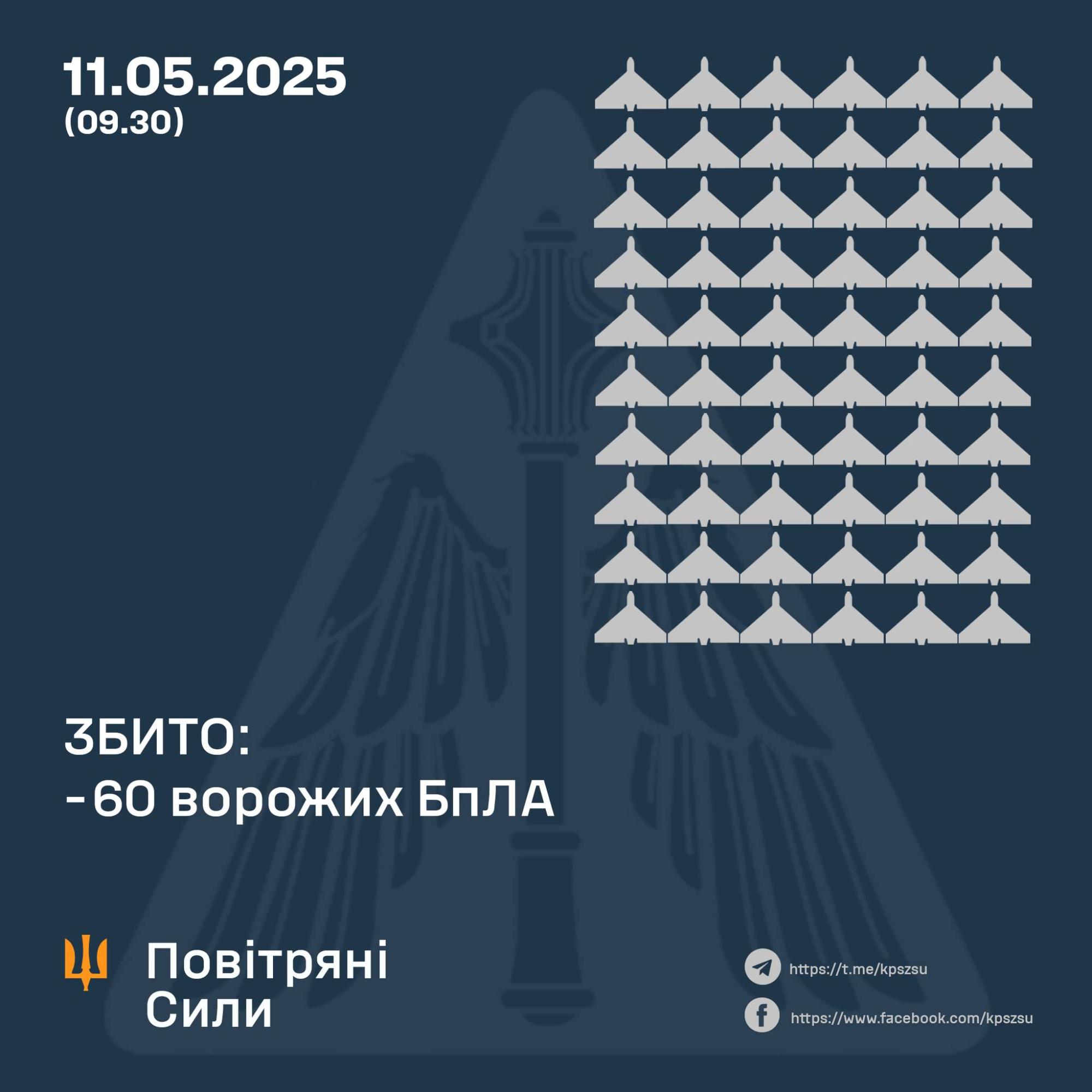 По состоянию на 09:30 военные подтвердили сбития 60 ударных БпЛА типа "Shahed" (беспилотников других типов) на Востоке, Севере, Юге и в центре страны. 41 вражеский беспилотник-имитатор – локационно потерян (без негативных последствий).
