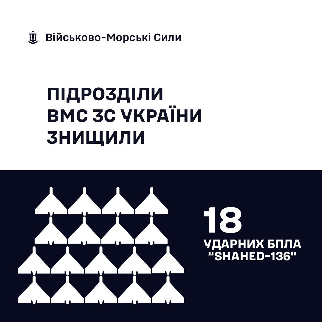 Сегодня ночью, 24 июля, во время очередной массированной атаки РФ военнослужащие ВМС ВСУ совместно с моряками-пограничниками сбили 18 российских ударных дронов-камикадзе типа "Shahed-136"