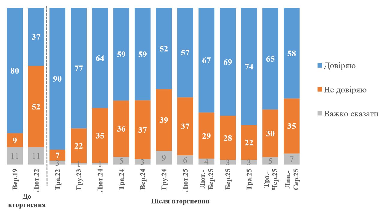 Отмечается, что после начала полномасштабного вторжения в 2022 году уровень доверия Президенту достиг 90%, но дальше снижался и относительно самый низкий показатель мы зафиксировали в декабре 2024 года – 52% (что, впрочем, все равно свидетельствовало о достаточно высоком доверии и о сохранении позитивного).