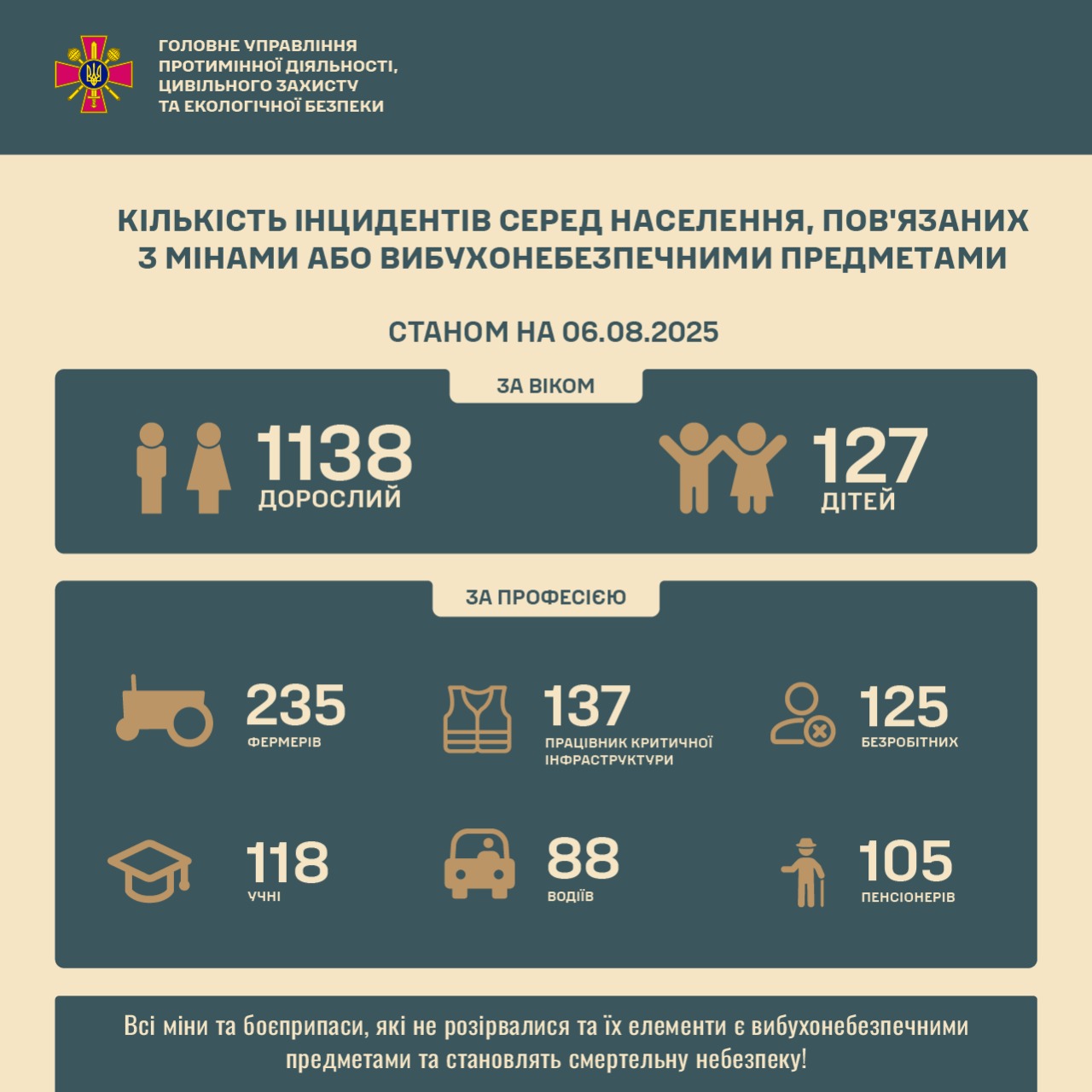 По состоянию на август в Украине зафиксировано 1265 случаев пострадавших гражданских лиц в результате взрывов на минах и других взрывоопасных предметах, оставленных после российского вторжения