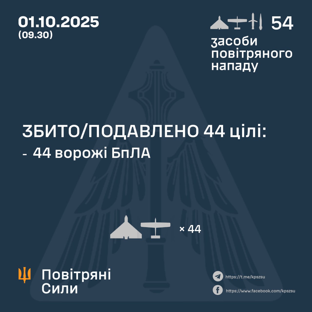 По состоянию на 09:30 противовоздушная оборона уничтожила или подавила 44 вражеских беспилотника типа Shahed, "Гербера" и других моделей в северных, восточных и центральных регионах Украины.