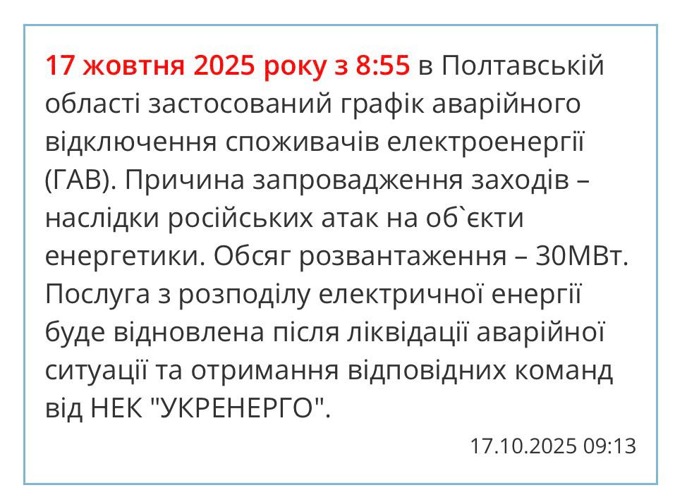 Аварийные отключения также затронули Полтавскую, Сумскую и Кировоградскую области, сообщают облэнерго соответствующих регионов. В Днепропетровской области ситуация похожая – там тоже применяют экстренные отключения.