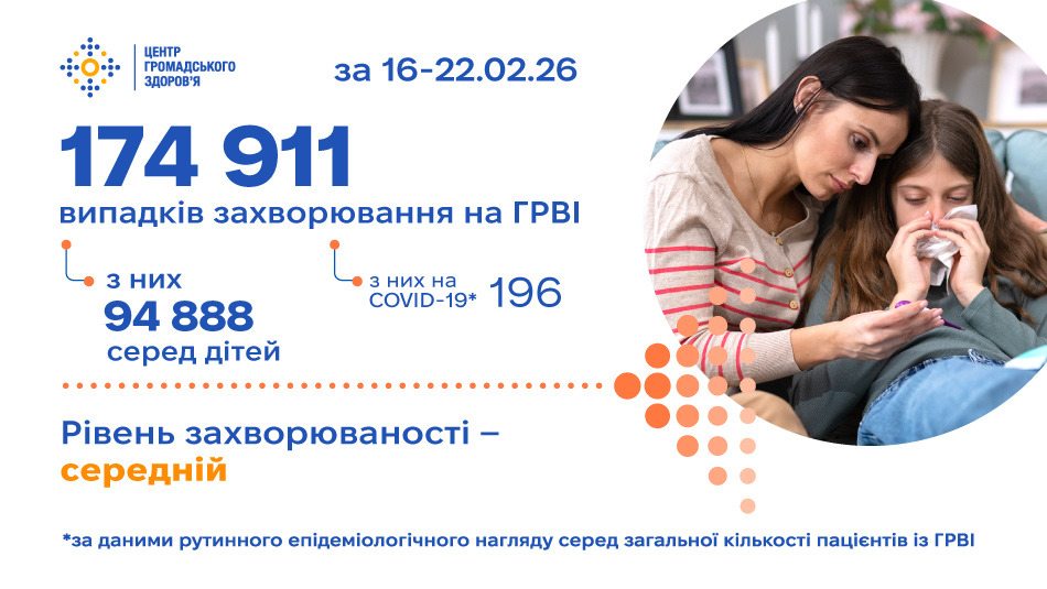За неделю с 16 по 22 февраля ОРВИ в Украине заболело 174 911 человек – 80 023 взрослых и 94 888 детей до 17 лет. Это на 4,1% больше, чем на прошлой неделе
