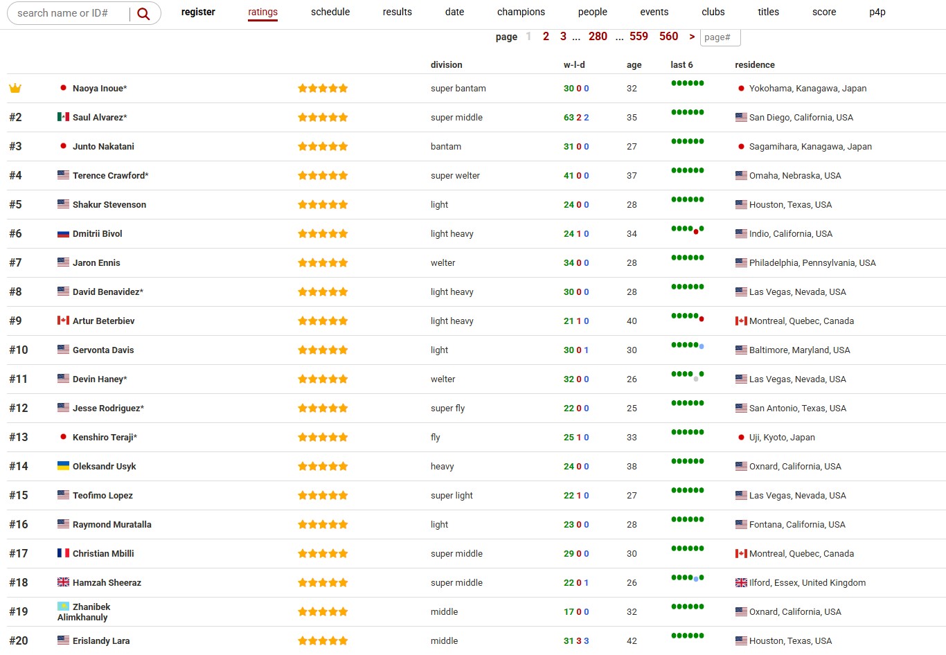 Так, лидером рейтинга P4P BoxRec является абсолютный чемпион мира во втором самом легком весе японец Наоя Иноуэ.