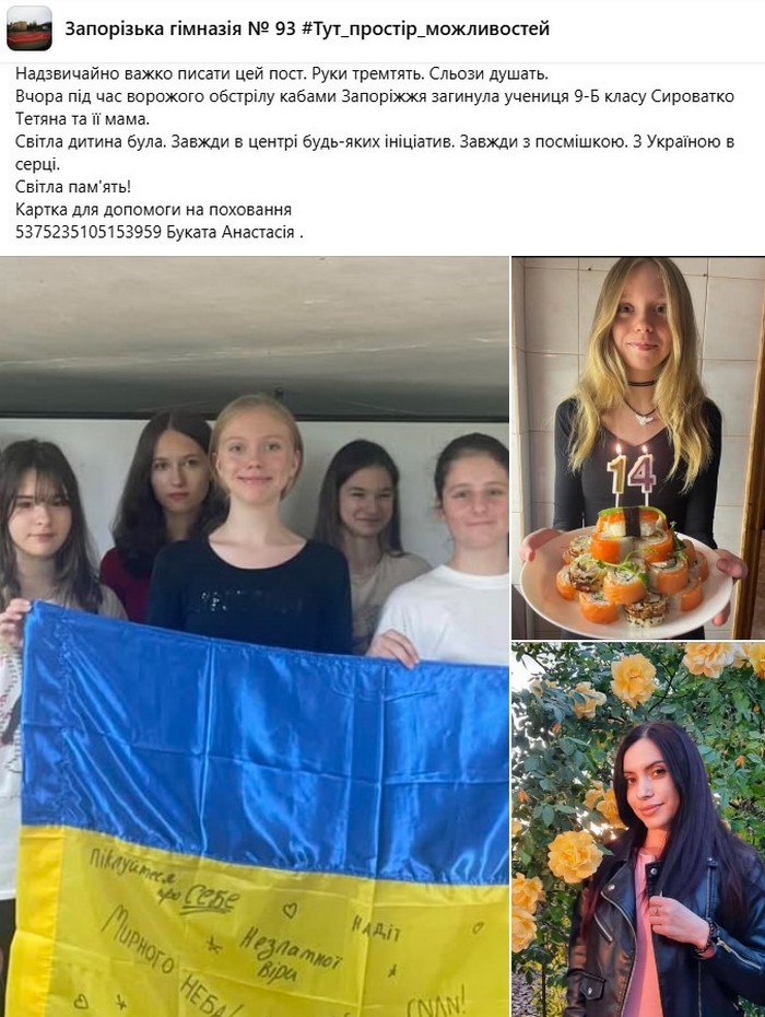 Секретарь Запорожского городского совета и исполняющая обязанности городского головы Регина Харченко уточнила, что вчера россияне убили двух школьниц.