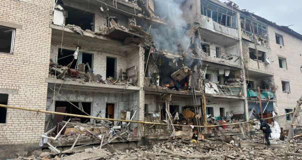 Отмечается, что в результате удара поврежден фасад, окна и крыша четырехэтажного жилого дома. В квартире на втором этаже возник пожар, который спасатели оперативно ликвидировали.