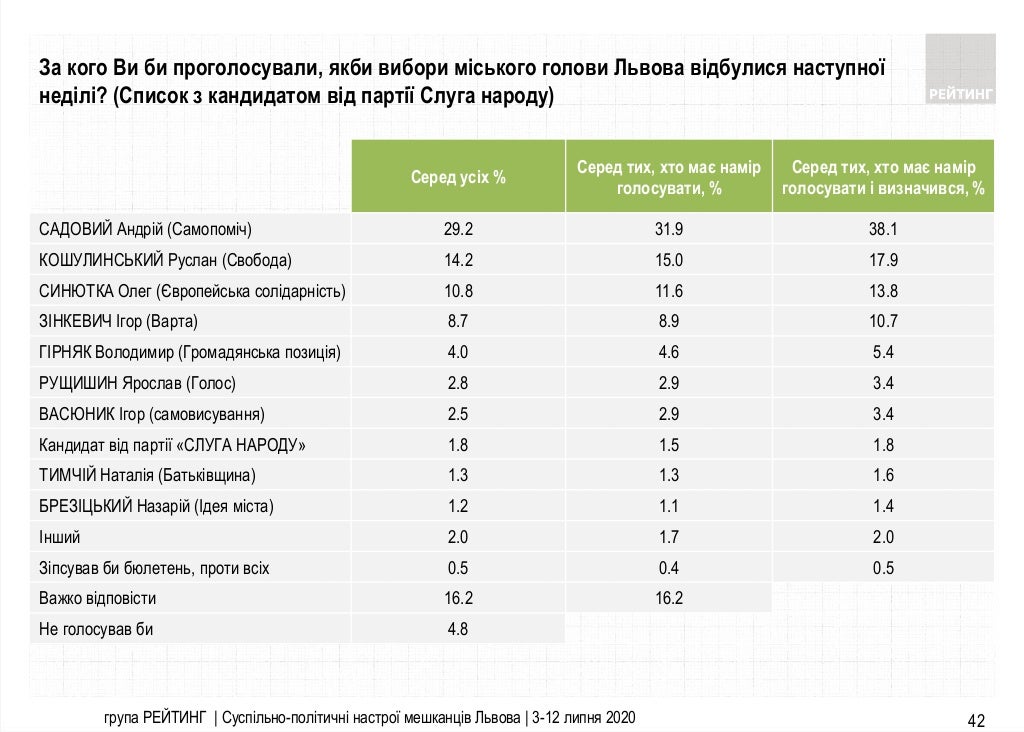 За Ігоря Зінкевича проголосували б 10,7% опитаних респондентів, за Володимира Гірняка – 5,4%, за Ярослава Рущишина – 3,4%, за Ігоря Васюника – 3,4%. Рейтинг інших – нижче 2%. Сюди входить й досі невідомий кандидат від "Слуги народу": показники підтримки висуванця від президентської партії у мери Львова, за замірами "Рейтингу", становлять всього 1,8%. Водночас тих, хто не визначився, – близько 16%.
