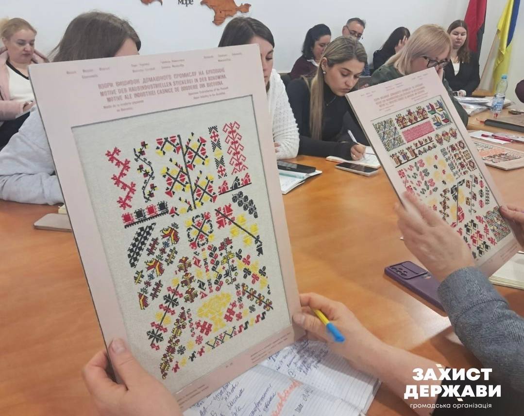 Керівниця Чернівецького осередку ГО "Захист Держави" Людмила Кушнір та співавторка проєкту, голова ГО "Вишиваний Дивотвір" Одарка Кучерява презентували проєкт "Вишитий шеврон-оберіг" та продемонстрували зразки, за якими сьогодні відроджується автентична буковинська вишивка.