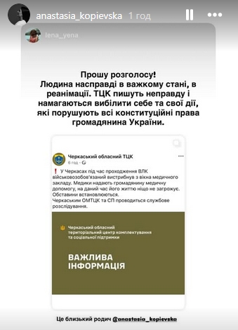 При цьому Анастасія Копієвська, племінниця постраждалого, заявила, що в ТЦК пишуть неправду. За її словами, зараз її родич у важкому стані в реанімації.