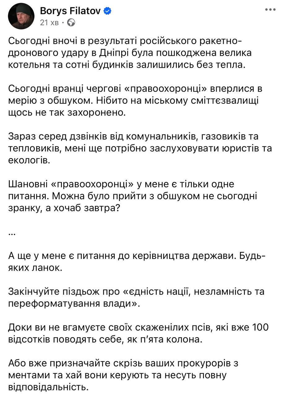 "Зараз серед дзвінків від комунальників, газовиків та тепловиків мені ще потрібно заслуховувати юристів та екологів. Можна було прийти з обшуком не сьогодні зранку, а хоча б завтра?" – написав мер.