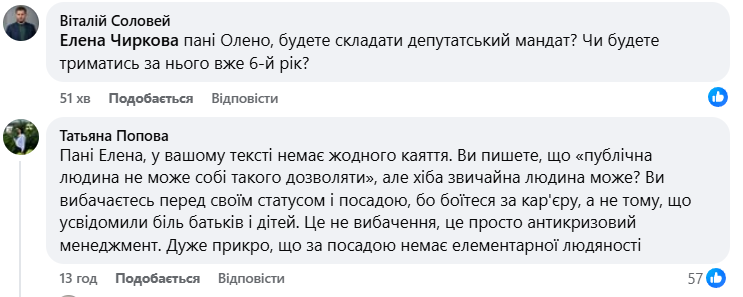 Голова облради Микола Лукашук назвав слова Чиркової приниженням людської гідності та ініціював розгляд інциденту комісією з етики.