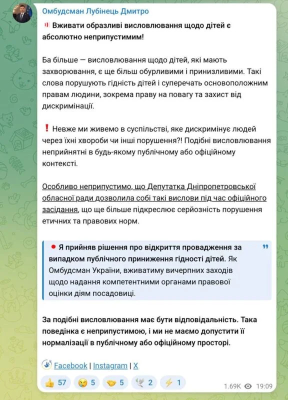 Втім, історія не згасла, а навпаки вийшла на новий рівень. Уповноважений Верховної Ради з прав людини Дмитро Лубінець відкрив провадження через публічне приниження гідності дітей.