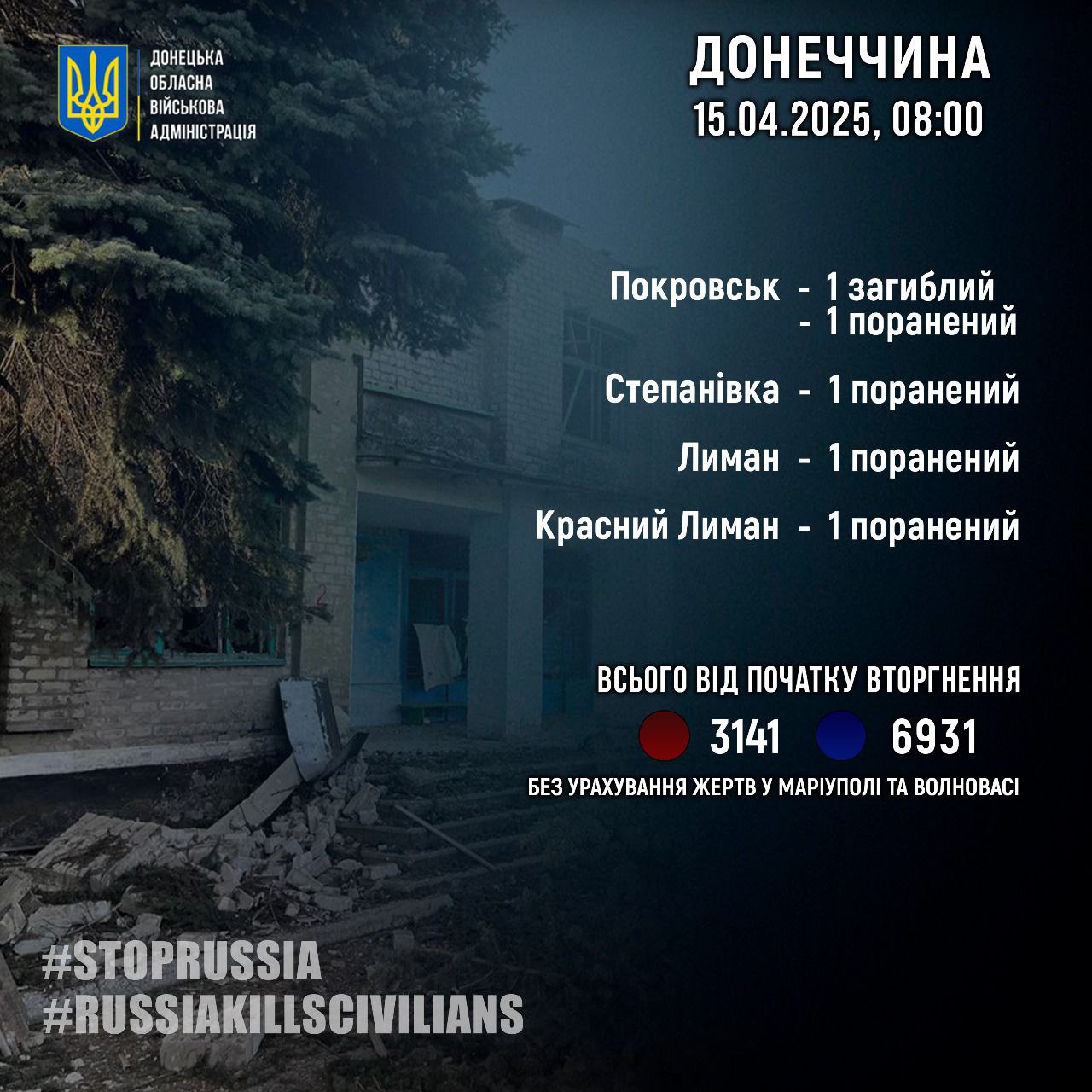 За його словами, за 14 квітня росіяни вбили 1 жителя Донеччини: у Покровську. Ще 4 людини в області за добу дістали поранення.