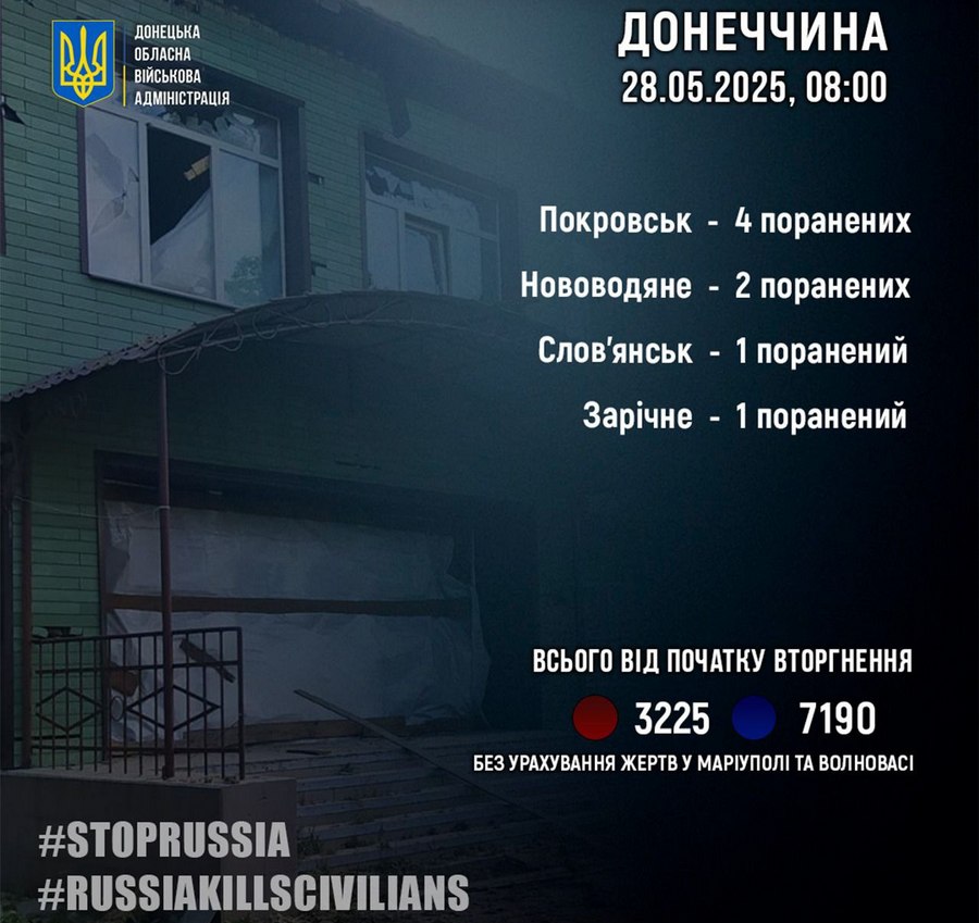 Вчора, 27 травня, внаслідок ворожих обстрілів Донецької області поранення дістали восьмеро мирних мешканців