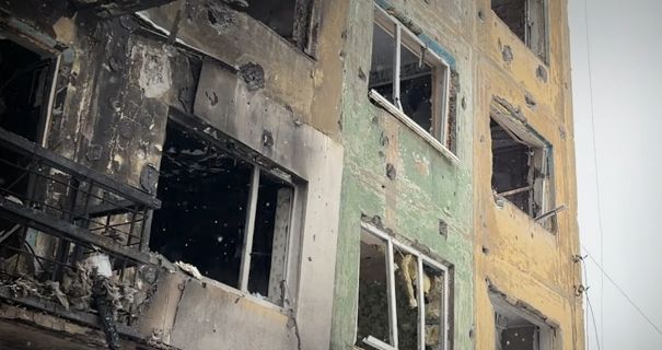 На кадрах видно пусті вибиті вікна, зруйновані цілі секції багатоповерхових будинків, знелюднені вулиці, спалені вщент автомобілі та магазини, покинуті й здичавілі домашні тварини.