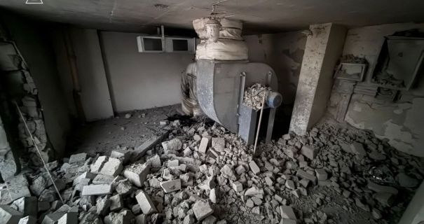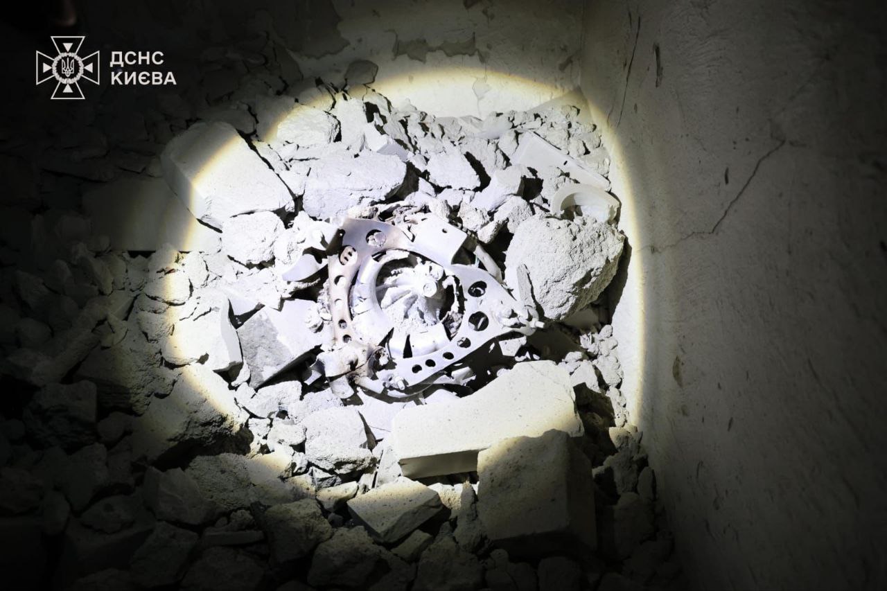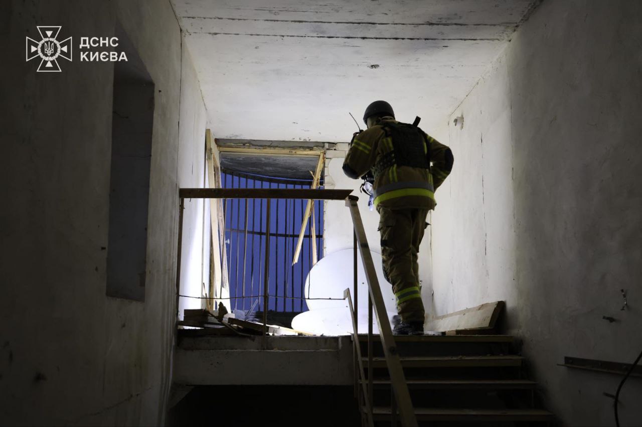 Влучання сталося на рівні технічного поверху. Зафіксовано руйнування стіни на площі близько 4 кв. м без подальшого горіння.