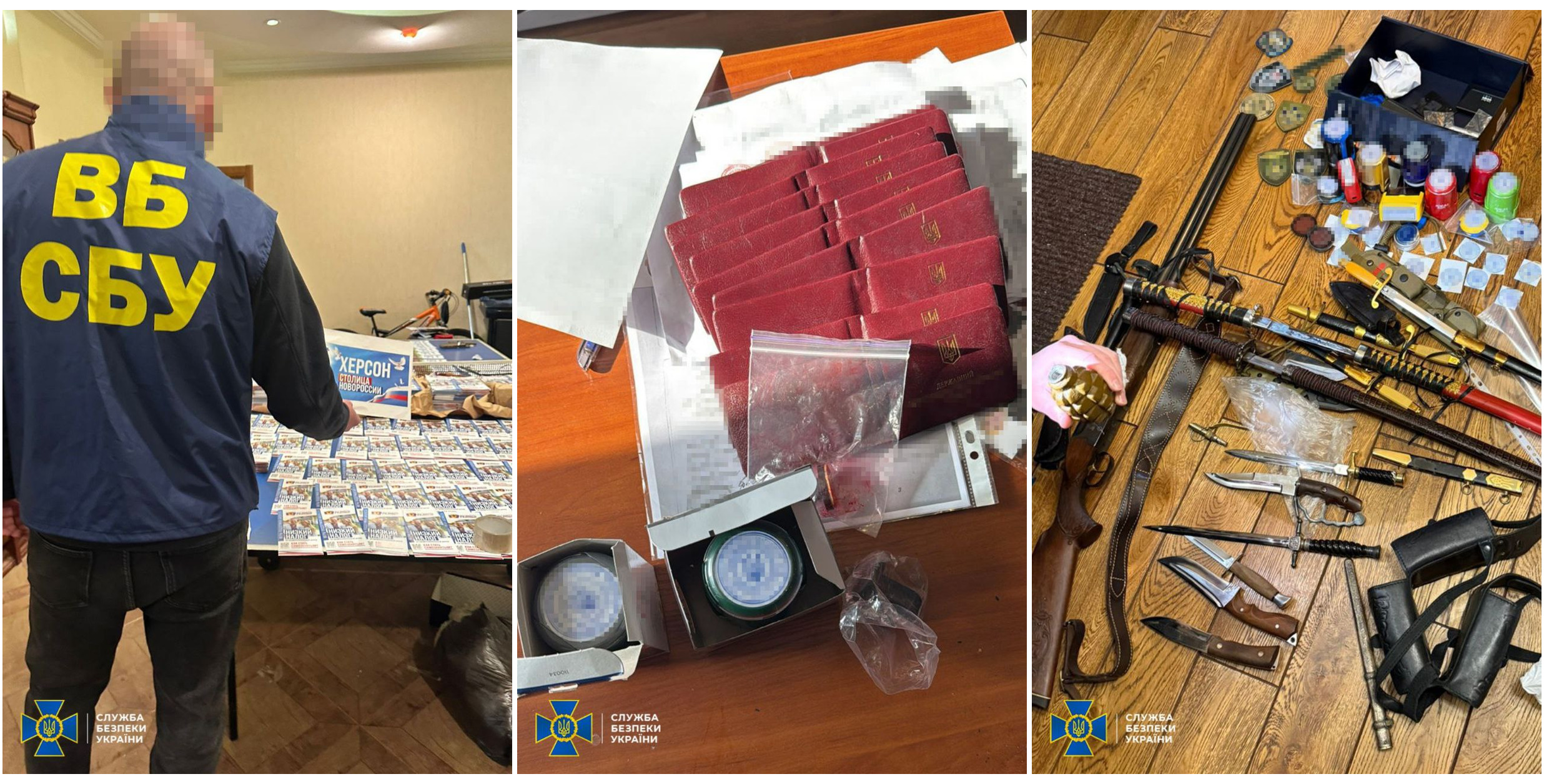 Під час обшуків в оселях та офісах фігурантів вилучили смартфони, комп’ютерну техніку, підроблені штампи та печатки держустанов та бойові засоби ураження. Крім того, у зловмисників вилучили близько ста "посвідчень" СБУ, інших воєнізованих та правоохоронних формувань, а також фіктивні накази, довідки і проросійські агітаційні листівки.