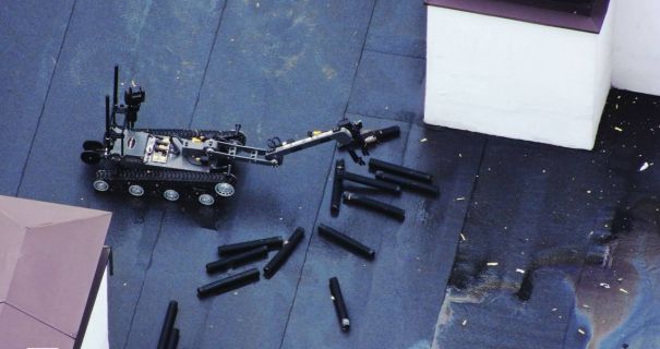 "Щоб мінімізувати ризики, оператори роботизованих систем та БпЛА використали в тандемі дрони та багатофункціонального робота, зокрема і на даху будинку. Робот обережно зібрав усі вибухонебезпечні предмети у спеціальну ємність, яку потім за допомогою крану завантажили в піротехнічний автомобіль", – розповіли у ДСНС.