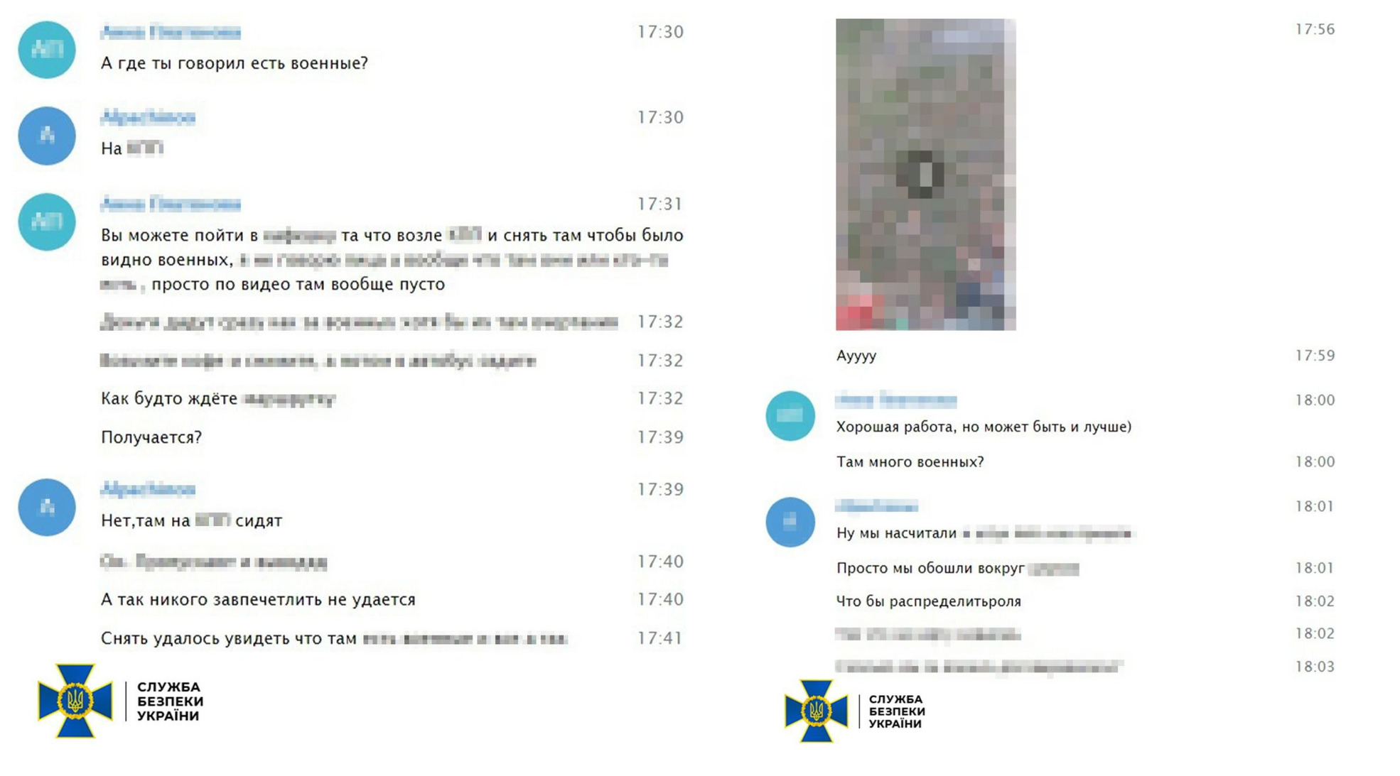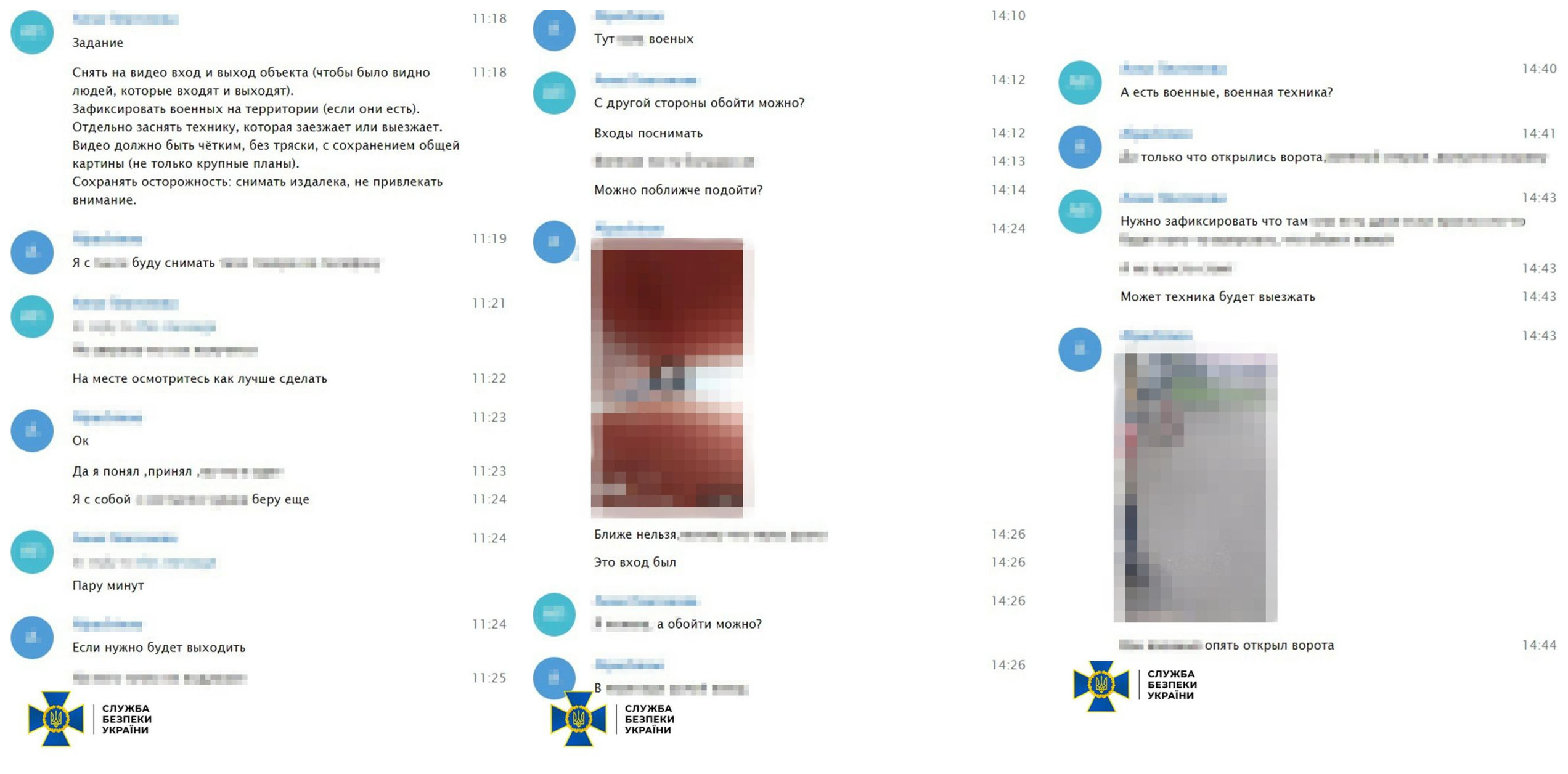 Також коригувальники обходили периметри потенційних "цілей" та фотографували їх з далекої відстані або знімали на відео під виглядом телефонної розмови. Зібрану інформацію вони месенджером пересилали ФСБ.