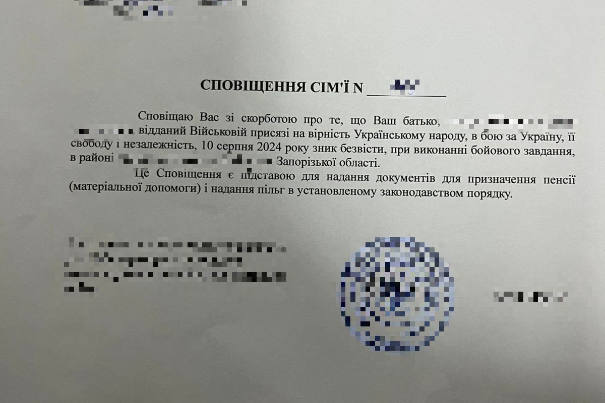 Згідно з "документом", батько чоловіка нібито зник безвісти на Запорізькому напрямку влітку 2024 року. Однак під час детальної перевірки з’ясувалося, що документ - підробка.