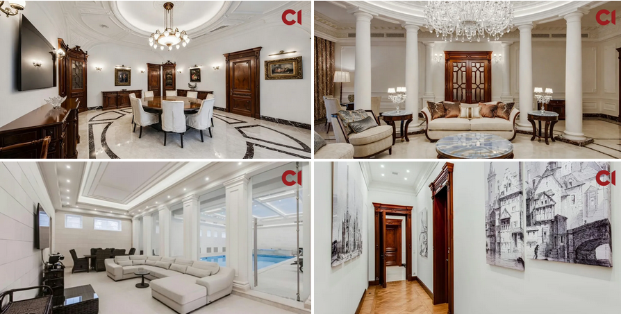 У будинку облаштовані камінна зала, кінозал, СПА-зона з басейном, сауна та хамам, тренажерний зал, бібліотека, кілька віталень і спалень, а також ліфт і система відеоспостереження. На території – гараж і паркінг на десять автомобілів.
