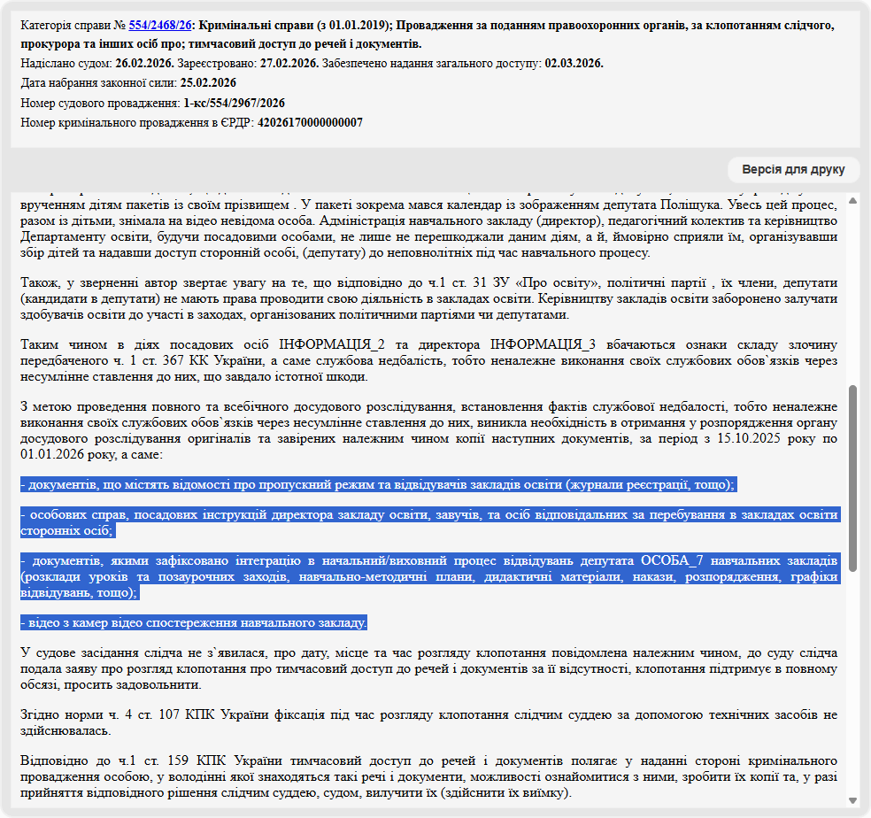 Правоохоронці перевіряють, на яких підставах і в якому статусі депутат долучався у навчальний та виховний процес шкіл. До документів, які можна вилучити, належать: