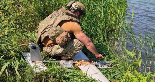 Безпілотник впав у прибережній зоні, тож для його пошуку використали квадрокоптер, а щоб дістатися до нього, довелося перетнути водойму на човні – іншого шляху не було.