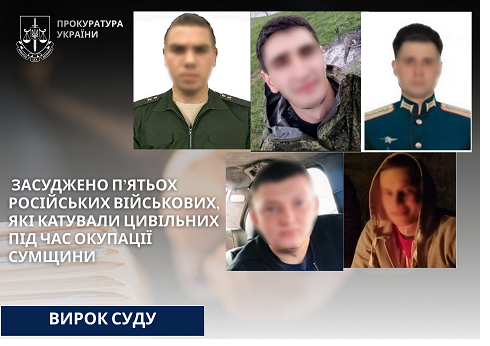 Суд заочно призначив покарання у вигляді десяти років позбавлення волі п'ятьом російським військовим. Вони катували цивільних під час тимчасового захоплення територій Охтирського району Сумської області на початку повномасштабної війни