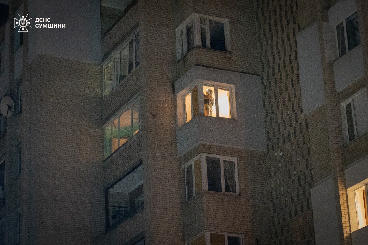 Наслідки нічних ударів по Сумщині: пошкоджена багатоповерхівка, виникла пожежа