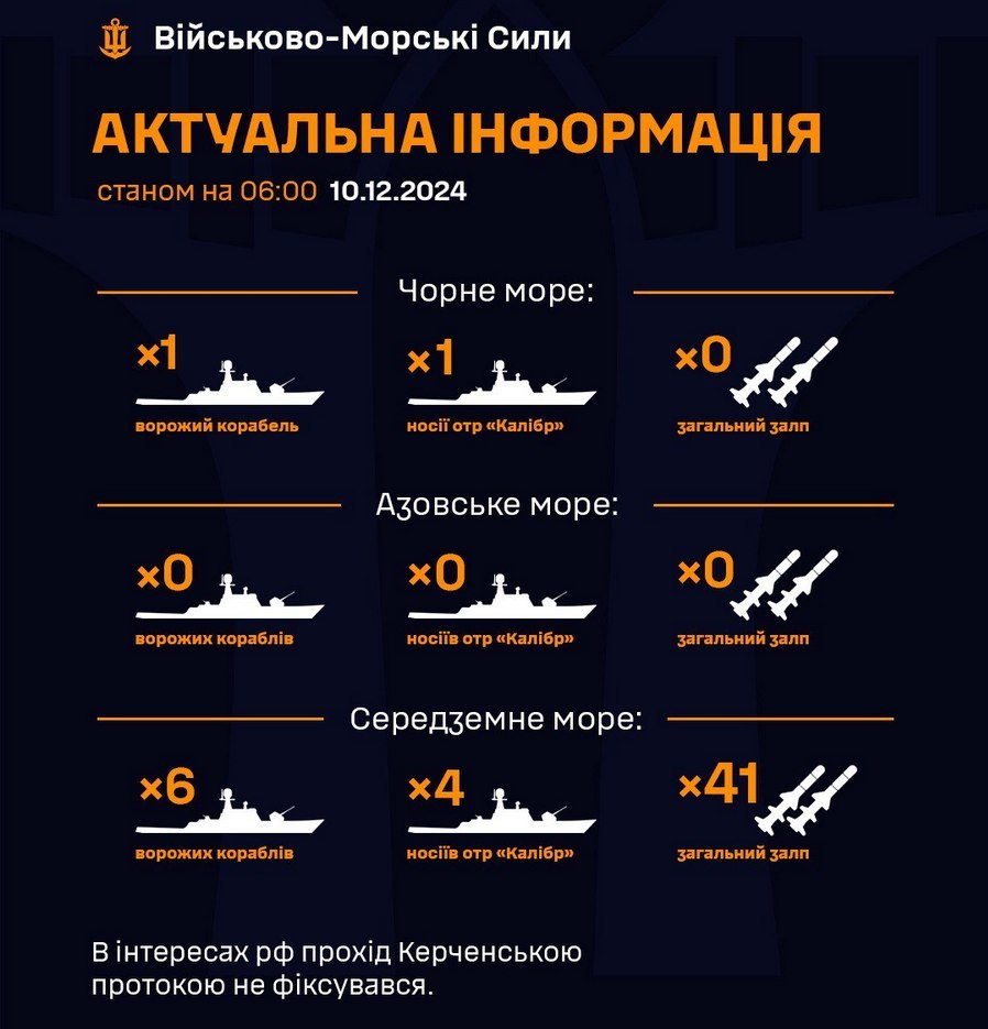 Станом на ранок вівторка, 10 грудня, російська окупаційна армія тримає в акваторії Чорного моря один ворожий корабель, який є носієм крилатих ракет "Калібр"