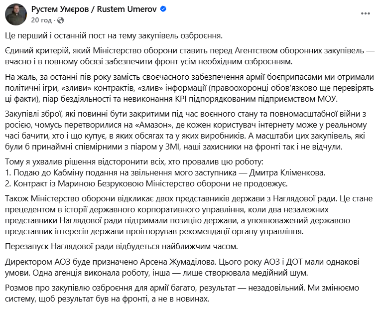 Крім того, Рустем Умєров анонсував призначення Арсена Жумаділова новим директором Агентства оборонних закупівель. Відповідно вже найближчим часом відбудеться перезапуск Наглядової ради.
