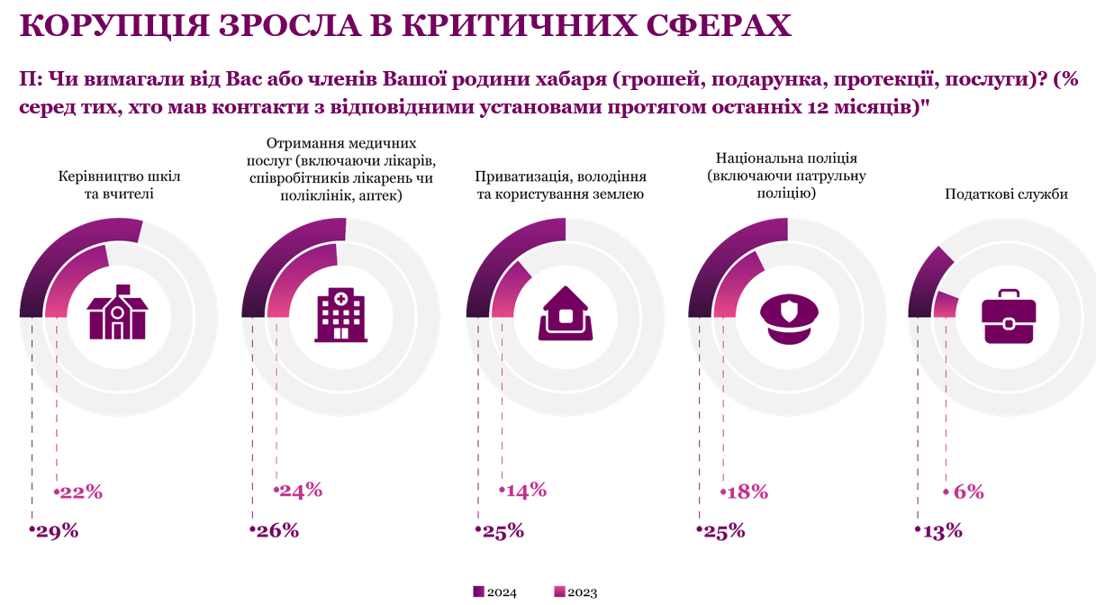 Так, 29% респондентів заявили, що керівництво шкіл та вчителі вимагали від них або членів родини хабаря (грошей, подарунка, протекції, послуги) протягом останніх 12 місяців.