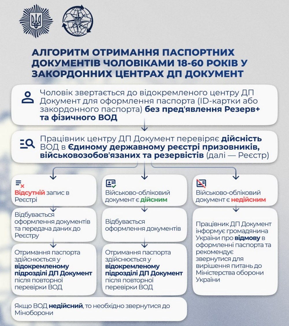 Для отримання паспортних документів за кордоном чоловікам 18-60 років необхідно звернутися до відокремленого центру ДП "Документ". Фізично предʼявляти військово-обліковий документ чи Резерв+ громадянам не потрібно. Через недійсні ВОД в оформленні паспорта відмовлять